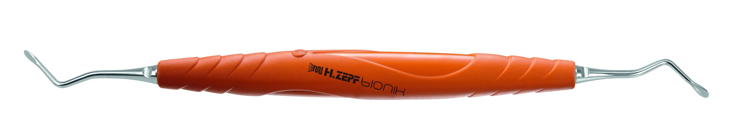 Eigenschappen – Curette voor tunnelen Fig #4 – curetten 2,5 mm breed – 45 grad. gespiegelde uiteinden – In oranje Bionik handvat